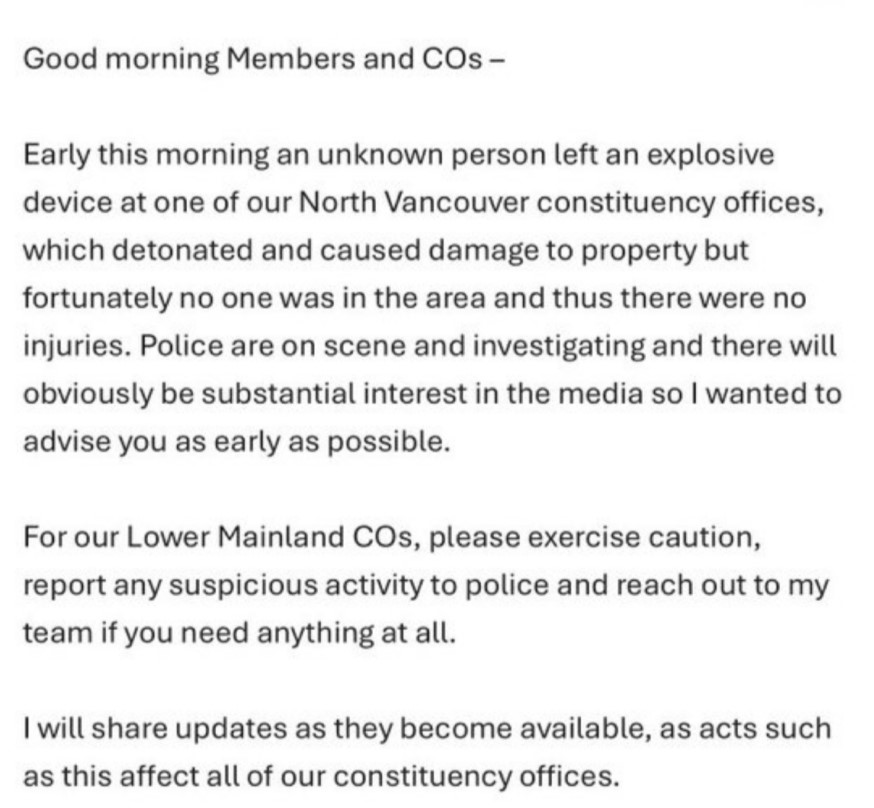 “Early this morning and unknown person left an explosive device at one of our North Vancouver constituency offices, which detonated and caused damage to property but fortunately no one was in the area and thus there were no injuries,” the email said.
