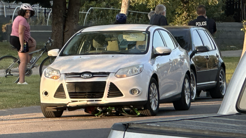 Images from the scene show a white car with a bike crushed underneath its front end.