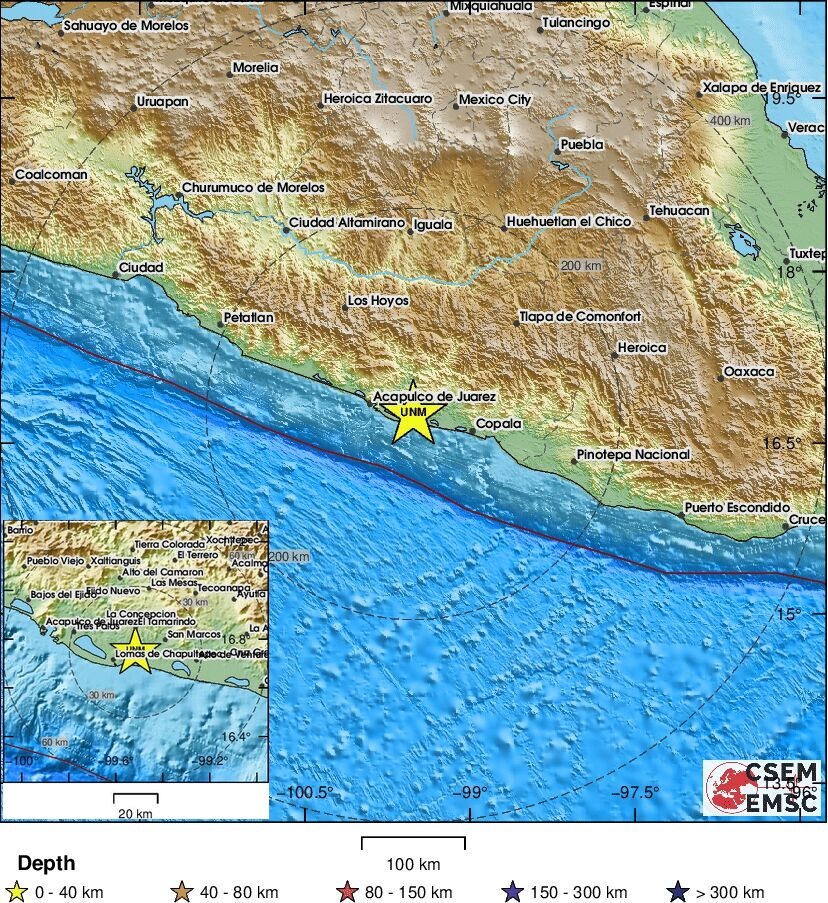 The U.S. Geological Survey said the earthquake occurred at a depth of 21.7 miles (35 kilometers), 2.5 miles north-northwest of Rancho Viejo, Guerrero, which is in the mountains about 57 miles northeast of Acapulco.